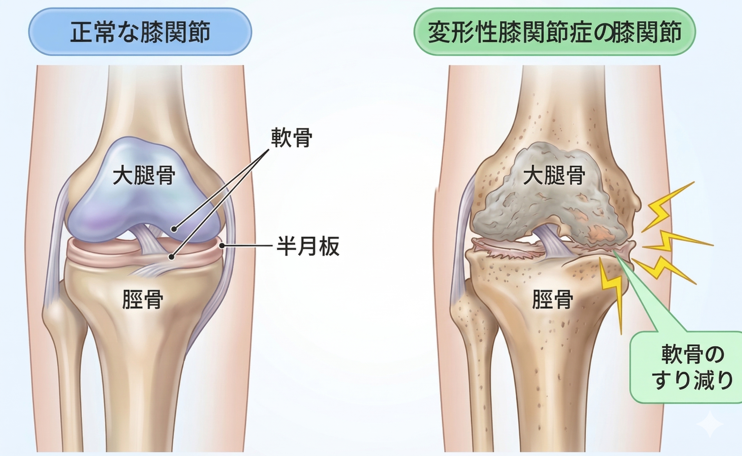 軟骨は骨と骨が直接ぶつかるのを防ぐクッションの役割を果たしていますが、これがすり減ることで骨同士がこすれ合い、強い痛みや炎症を引き起こします。
